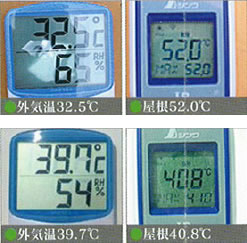 塗装前、外気温32.5℃で計測した屋根表面温度は52℃まで上昇。 塗装後、外気温39.7℃で計測した屋根の表面温度が408℃に。